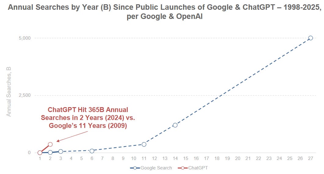 Notice how the global curve for ChatGPT adoption is nearly vertical compared to the slow, steady climb of the early internet. This wasn’t a U.S.-first rollout — it was global from day one.
