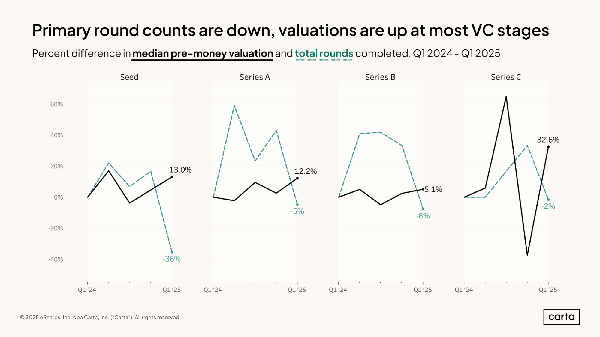 The latest Carta data for Q1 2025 reflects what I heard repeatedly in conversations with growth and VC funds in New York last week: the bar for raising capital is high—but for companies that meet it, there's appetite.