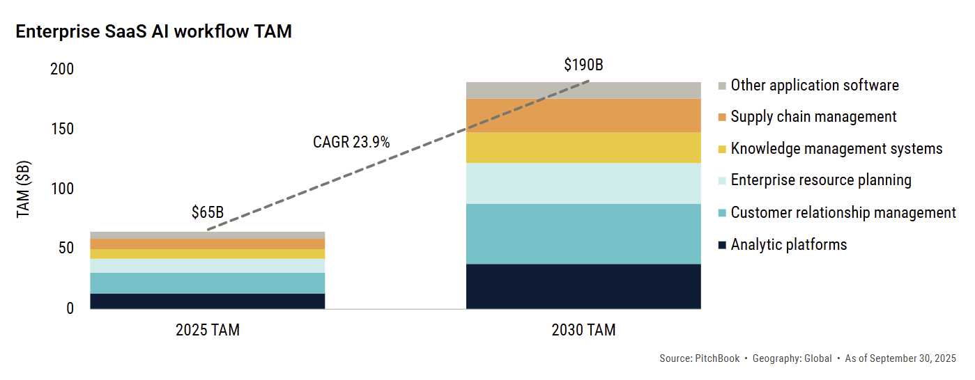 Despite this near-term slowdown, PitchBook emphasizes that the long-term TAM for enterprise software remains enormous — and continues to expand. Global enterprise software spending is expected to grow steadily over the next decade, driven by ongoing digitization, automation, and, increasingly, AI adoption. Rather than shrinking the market, AI is reshaping it. Entirely new categories are emerging — particularly around autonomous workflows, AI agents, and decision automation — which expand the scope of what software can do inside organizations.