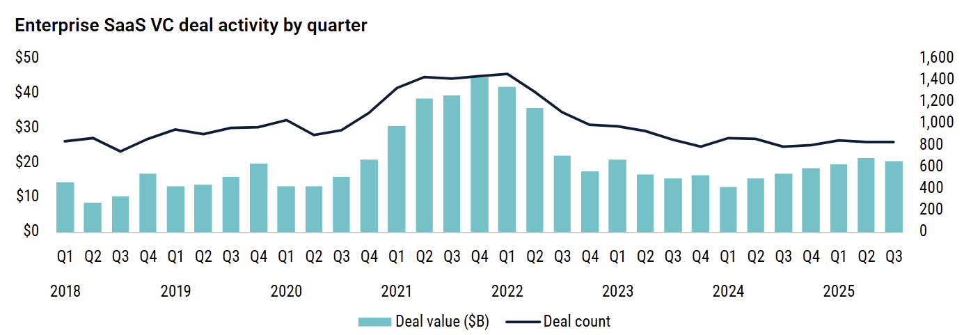 Moving on, Pitchbook also published an interesting paper on the theme. One of the most notable findings is that enterprise SaaS deal activity has plateaued after a decade of uninterrupted expansion. Following the surge in 2020–2021, fueled by zero interest rates and accelerated digital transformation, deal volume and capital deployment have stabilized at materially lower levels. Investors are no longer funding SaaS growth indiscriminately; instead, capital is concentrating in fewer companies with clearer differentiation, stronger retention, and credible AI integration strategies. This reflects a shift away from the “growth-at-all-costs” mindset toward a more disciplined focus on durability, efficiency, and long-term defensibility.