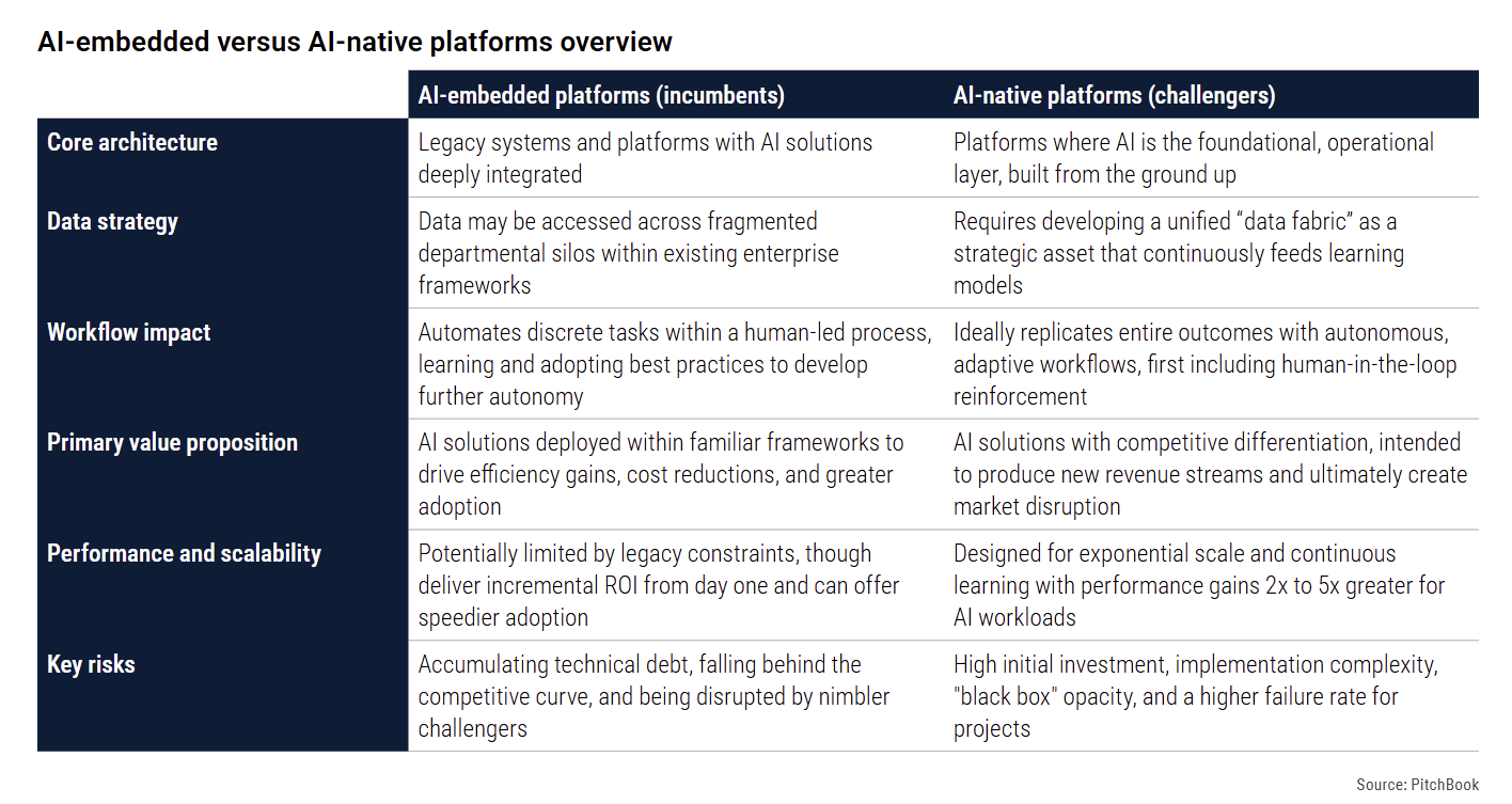 A critical distinction the report highlights is the divergence between AI-embedded incumbents and AI-native platforms.