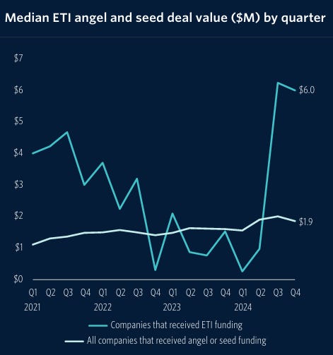 On to a lighter theme (and more usual to this newsletter), Pitchbook’s Emerging Tech Indicator for Q4 2024 showed that top-performing VC firms slightly scaled back their overall investment pace but continued to prioritize large-scale deals. AI and machine learning remained the leading sectors, while climate tech and biotech also attracted significant capital. The standout deal of Q4 was Pacific Fusion, a nuclear startup, which raised an impressive $900 million in its Series A round.