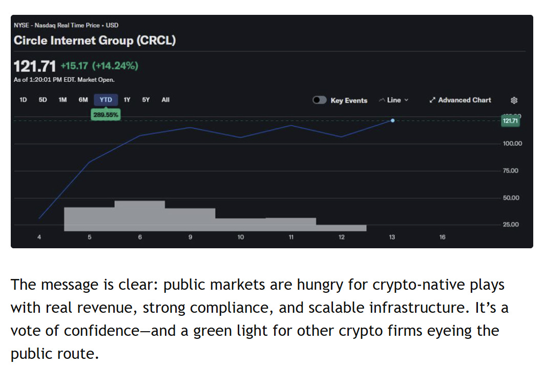 This week marked a potential turning point for the U.S. IPO market, with two high-profile fintech names—Chime and Circle—making their public debuts. Both deals were technically down rounds relative to their last private valuations, and that’s worth emphasizing: Chime, once valued at $25 billion, went public at a valuation closer to $11 billion, while Circle, which had previously aimed for a $9 billion SPAC deal in 2022, began trading at around $4.5 billion. And yet, both listings were clear market successes. Chime (CHYM) jumped over 37% on its first day, closing around $37 and now trading near $34–35. Circle (CRCL) saw a dramatic surge, climbing from its $31 offering price to over $130 within days—a gain of over 300%.
