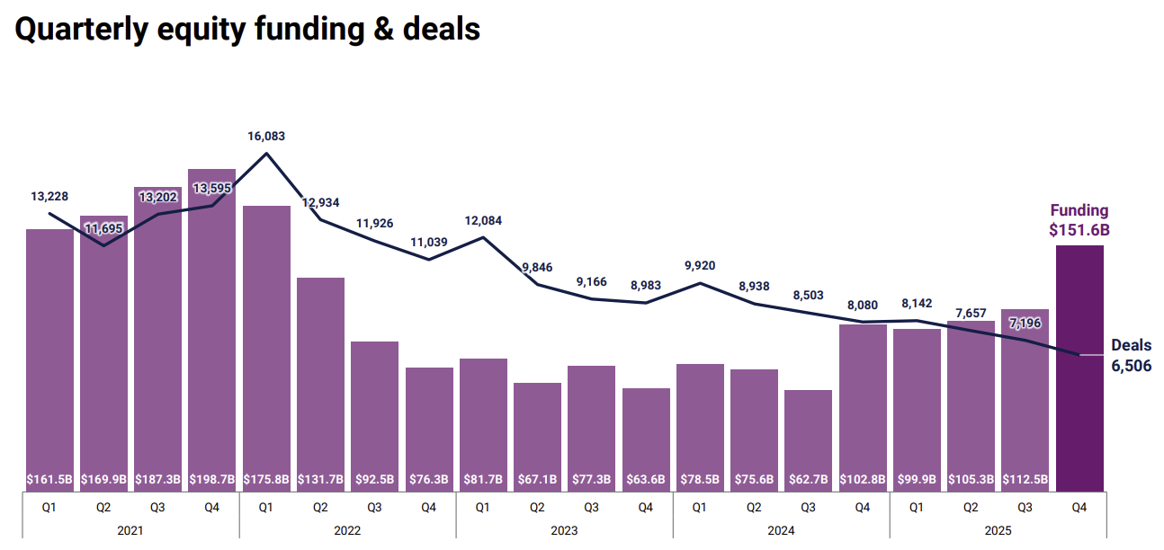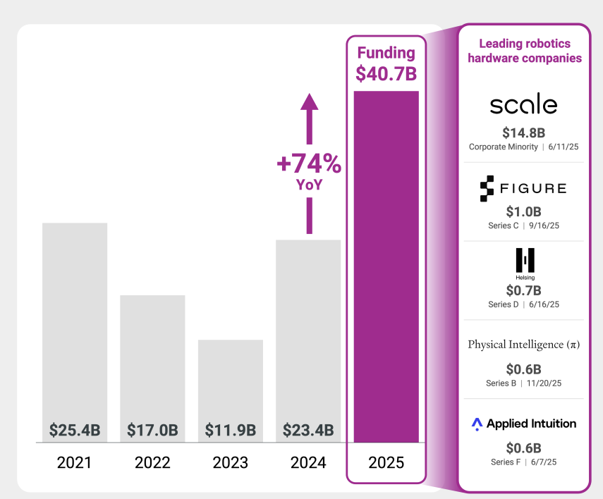 CB Insights’ State of Venture framing is clear: funding and exits climbed to a three-year high, “decacorns raised record dollars,” and even niche category callouts — such as humanoid robots leading deal count growth — point to the same conclusion: investors are paying up for conviction themes. Robotics emerged as the next frontier, with funding jumping 74% YoY, from $23.4B in 2024 to $40.7B in 2025.