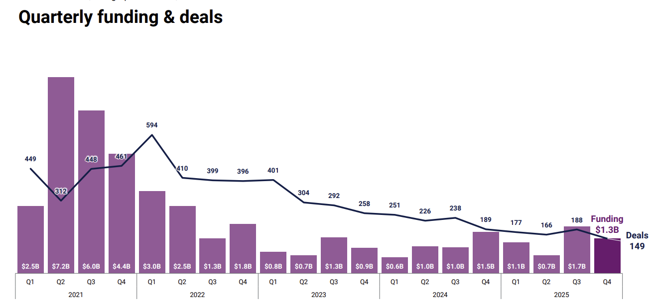 ~$1.7B in equity investment in 2025, down 34% YoY (from ~$2.6B in 2024)