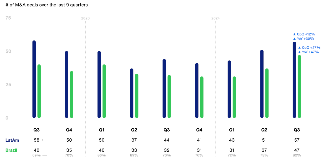 Sector-wise, fintech dominated, drawing 43% of total funding. Shifting gears to the hot topic of the moment—AI startups (whether AI-enabled or AI-first)—they pulled in USD 194M across 37 rounds in LatAm. On the M&A front, things are starting to gain momentum, as expected due to the alignment of bid and ask prices as mulltiples reach a common ground. There were 57 M&A deals this quarter, a striking 30% increase YoY and a 12% bump QoQ.