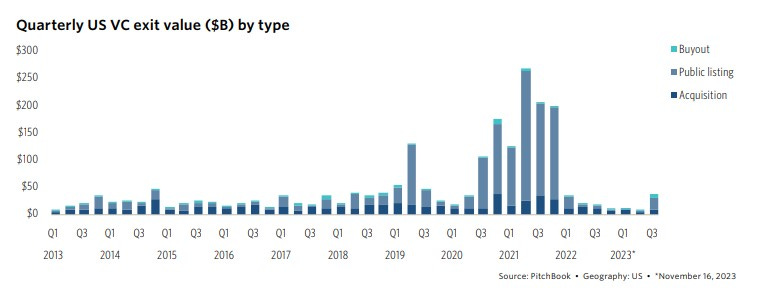 As mentioned last week, in 2023, the U.S. economy remained strong with a 5.2% GDP growth and solid labor and corporate earnings. Despite multiple rate hikes by the Federal Reserve, there's optimism about a possible rate cut by mid-2024. However, the IPO market has been slow for 18 months due to high interest rates and market volatility, especially affecting tech sector valuations. This resulted in a significant decrease in public listings of VC-backed companies, with only 60 listings totaling $28.2 billion in 2023, a steep drop from the much higher values seen in 2020 and 2021.