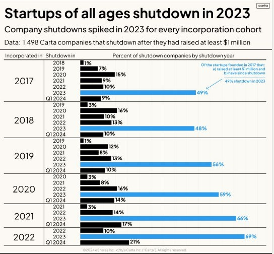 The week was full of great reads, so we have a lot to cover. To start off, Peter Walker from Carta shared an interesting post. Data shows that in the early months of 2024, the startup ecosystem experienced shutdowns, particularly reflected in the activities of companies listed on Carta that had secured a minimum of $5 million in priced equity. The first two months saw 61 startups ceasing operations, a number surpassing the total closures in the last quarter of 2023, even before March figures were included.