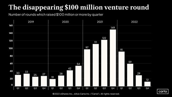 To wrap up, I also saw an interesting graph by Carta this week. It is no news that growth rounds were hit the hardest – in fact, they were down 80% or more in 2022. But, when we look at USD 100mm rounds, the situation was in fact, worse. Q4, for example, was inferior than any other quarter in 2019, 2020 and obviously 2021. From what I can recall, this is the only piece of data that I saw until now that shows a detraction even when comparing to historical levels. The only quarter that came close was the “Covid Quarter” of Q1’20, but even when we look there, there were 19 $100m+ rounds – versus 12 this past quarter.