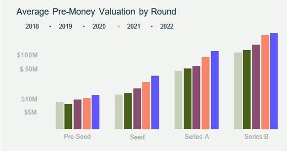 The report shows that early-stage venture performance saw a slow, and then sudden, decline in 2022. While the funding outlook for startups is becoming less favorable, valuations at the close of 2022 indicate a more buyer-friendly market in 2023. Fintech continues to represent the largest share of investment activity and capital deployed when looking at the AngelList base. As mentioned last week, even though 2022 showed a decline across the board when compared to 2021, it was still a positive year when we look historically. As an example, 4Q22 was nearly identical to 2Q20. Moreover, looking at the pre-money valuations by round, year-over-year, average valuations increased at all stages in 2022. While reports indicate VCs are scaling back round sizes as capital becomes more expensive, this factor does not yet appear to have materialized in the valuation data. Compared to 2021, pre-seed valuations grew by 18.8% in 2022 to $11M. Seed-stage valuations grew by 43.7% to $30.6M, Series A valuations grew by 21.3% to $104.3M, and Series B valuations grew by 9.7% to $340.SM.