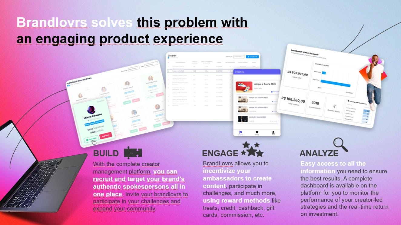 Brandlovrs is a SaaS with fintech-like features that empowers brands with technology to activate and nurture relationships with creators at scale, driving social buzz, growing revenue and tracking ROI in real-time. While brands enjoy creator-led marketing that scales beautifully, creators benefit from making more income, in a more predictable way, and from a wider choice of partners. Our vision is to empower every creator in LatAm to make a living from their passion, enabling the region’s creator economy middle class to thrive.