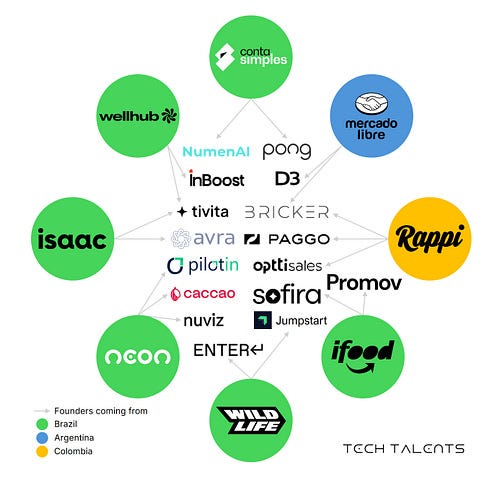 Also, before we dive in, I wanted to share an interesting study conducted by my co-writer in this series. By leveraging Tech Talents’ database, the study identified the emergence of a new wave of tech mafias or talent hubs in Latin America — extending beyond the well-known “Rappi Mafia.”